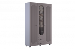 Шкаф оснащён тремя распашными дверями: две крайние двери выполнены из МДФ, а средняя дверь дополнена зеркалом, которое визуально расширяет пространство и делает комнату светлее. В нижней части предусмотрены два выкатных ящика, подходящих для хранения белья, аксессуаров или повседневных вещей.