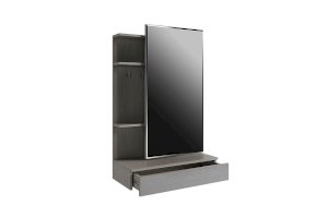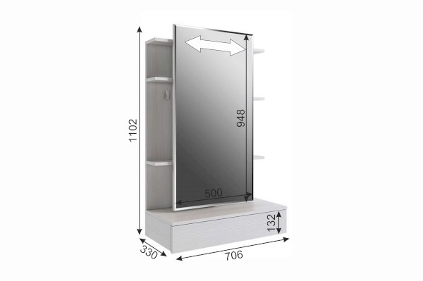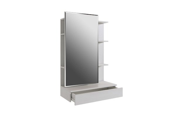 Зеркальная панель трюмо работает по принципу шкафа-купе, что обеспечит вам легкий доступ к вещам, которые лежат на полках за зеркалом.