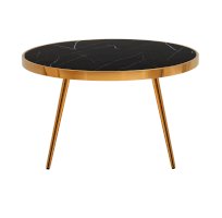Столешница выполнена из закаленного стекла, которое обладает повышенной прочностью и стойкостью к перепадам температур, способно выдерживать большие нагрузки. Поверхность столешницы декорирована рисунком черного мрамора, который идеально сочетается со стальными ножками в золотом цвете.
