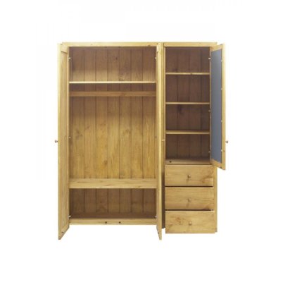 Трехстворчатый шкаф для вещей из коллекции “Калипсо” удачно впишется в интерьер загородного дома или небольшой квартиры. Он отличается простым, но при этом практичным дизайном. Внутри вы найдете отделение для одежды со штангой, секцию с полками и тремя ящиками. Шкаф состоит из 2 частей (двойное левое отделение и правое одиночное отделение).