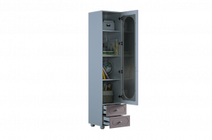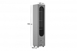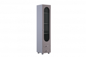 Модель оснащена одной распашной дверцей с вставкой из прозрачного рифлёного стекла, а также двумя вместительными выкатными ящиками в нижней части для хранения одежды, текстиля или аксессуаров. Внутреннее наполнение можно выбрать в зависимости от задач: шкаф комплектуется полками или штангой для плечиков, что позволяет адаптировать его под разные потребности.
