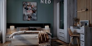 Распашной четырехстворчатый шкаф для одежды и белья Neo — практичная и функциональная система хранения в спальне. Шкаф отличает стильный дизайн, в облицовке использованы материалы трендовых цветов: Дуб Шавиниган и Антрацит. Лаконичные квадратные металлические ручки с гальваническим покрытием придают модели брутальный вид. Гардероб имеет классическое наполнение: два боковых отделения с полками для текстиля, центральное - с выдвижными ящиками на шариковых направляющих и отделением со стационарной штангой для плечиков. Дверцы центральной части шкафа оформлены зеркальным полотном, благодаря чему модель становится визуально легче, а комната выглядит более светлой и просторной.