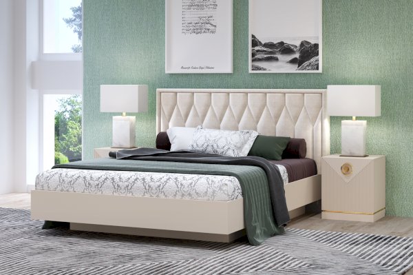 Кровать с невероятно красивой мягкой спинкой это поистине королевский выбор для вашего интерьера. Модель изготовлена в нежной пастельной гамме с применением ЛДСП сатин и ткани – микровелюр Catania ivory, благодаря теплой и светлой палитре она может сочетаться с широким выбором холодных и теплых оттенков в интерьере. Используйте покрывало в контрастных цветах чтобы подчеркнуть и раскрыть красоту мебели.