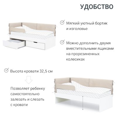 Для удобства хранения игрушек или постельных принадлежностей, вы можете приобрести 2 вместительных ящика, которые устанавливаются под основание кровати.