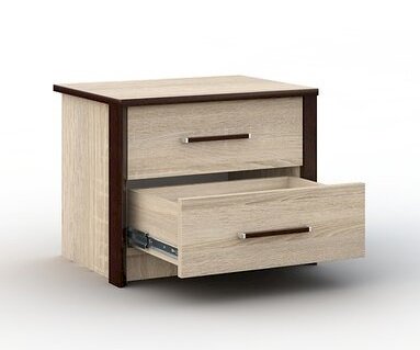 Прикроватные тумбы выполнены в стиле минимализм: строгие черты, функциональность и простота. Контрастный профиль из МДФ 22мм по внешним углам со скругленными краями для максимально безопасного использования мебели. Кромка цвета венге подчеркивают древесную текстуру и рисунок светлого дуба сонома, придает эффектный вид. Прикроватные тумбы с двумя ящиками на телескопических направляющих поместят в себя все вещи, которые важно иметь под рукой - телефон, светильник или любимая книга. Идеально дополняют кровать Эшли.