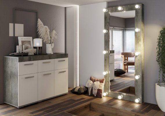 Светлые матовые фасады, стильный корпус в цвете бетон, лаконичные хромированные ручки – все это про модель комода Инстайл из одноимённой мебельной коллекции. Размеры комода позволяют разместить в нем большое количество вещей. В верхних выдвижных ящиках можно хранить украшения или аксессуары.