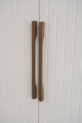 Петли с доводчиком обеспечивают плавность хода при открывании и закрывании, а ручки из массива дуба придают шкафу приятный стиль.