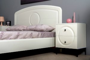 Кровать установлена на высокие ножки, что делает конструкцию лёгкой и воздушной, изголовье кровати декорировано фрезеровкой. Матрас укладывается на ортопедическое основание с гнутоклееными ламелями.