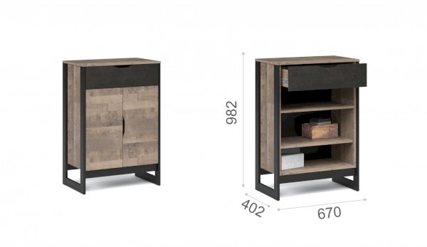 Комод включает выдвижной ящик и шкаф с распашными дверями и полкой внутри