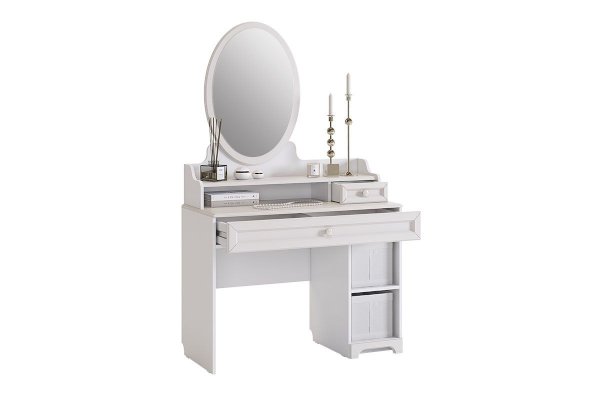 Трюмо из серии «Белла» – настоящая находка для истинных леди. Трюмо сочетает в себе утонченный дизайн, функциональность и удобство. Столешницу из МДФ украшает фрезеровка. Декоративная кисть на ручке окончательно подчеркнет изящество изделия.